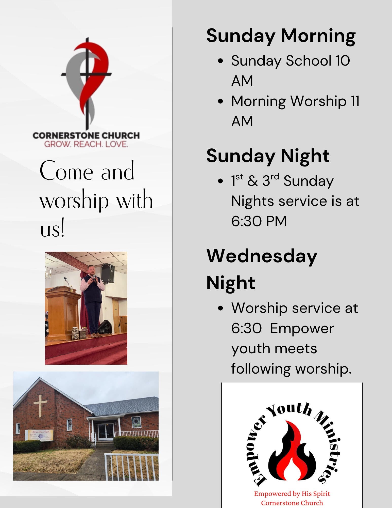 Our mid-week service on Wednesday nights also includes our youth and children. Empower youth meets downstairs following worship. Children/nursery is available.